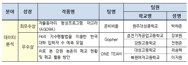 ▲ 제7회 교육 공공데이터 분석·활용대회 수상내역(강원) |