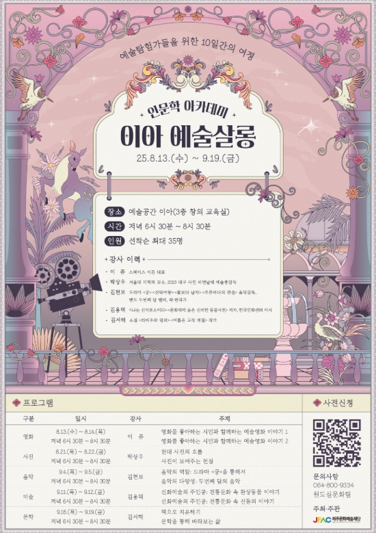 [뉴스노크=김인호 기자] 제주문화예술재단은 오는 8월 13일부터 9월 19일까지 예술공간 이아에서 예술 인문학 강연 프로그램 '이아 예술살롱'을 운영한다. 이번 프로그램은 영화, 사진, 음악, 미술, 문학 등 다섯 가지 예술을 중심으로, 각 주제별로 두 차례씩 총 10회에 걸쳐 진행된다. 예술에 관심은 있지만 시작이 어려운 초심자도 부담 없이 참여할 수 있다.