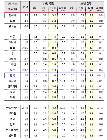 향후 세계경제 성장률은 ’25년 3.2%, ’26년 2.9%, ’27년 3.1% 수준으로 전망된다. 지역별로 살펴보면, 미국은 고용 부진과 관세 인상에 따른 물가 전가 등의 영향으로 ’26년 성장세가 둔화(’25년2.0→’26년1.7→’27년1.9%)될 전망이다. 일본은 금년 내수를 바탕으로 견조한 성장을 기록하겠으나 순수출이 하방요인으로 작용하며 성장세가 둔화(’25년1.3→’26년0.9→’27년0.9%)될 것으로 예상된다. 유로 지역은 ’26년 소폭 둔화된 이후 내수 회복과 무역 반등에 힘입어 ’27년 회복(’25년1.3→’26년1.2→’27년1.4%)할 전망이다. 중국의 경우 부동산 부문의 지속 부진과 조기선적 효과 소멸 등의 영향으로 성장세가 둔화(’25년5.0→’26년4.4→’27년4.3%)될 전망이다.