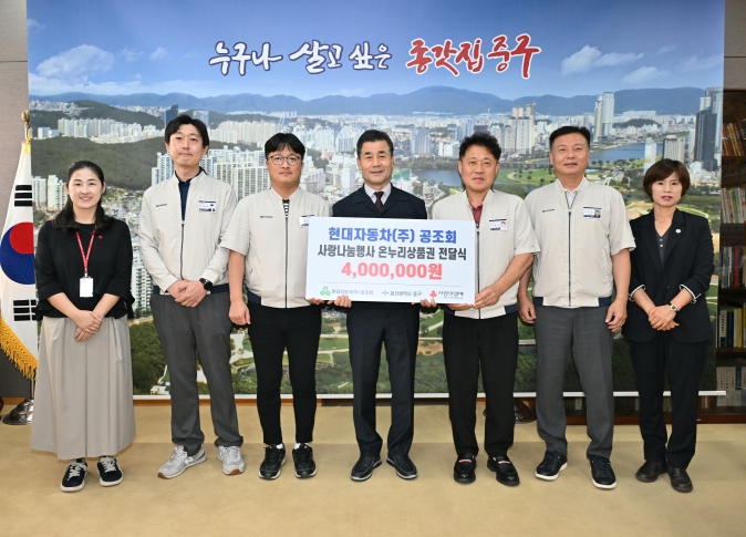 현대자동차㈜ 공조회는 지난 2022년부터 매년 중구에 어려운 이웃을 위한 온누리상품권 500만 원을 전달하고 있으며, 올해는 400만 원을 추가로 기탁하는 등 꾸준히 이웃사랑을 실천하고 있다.