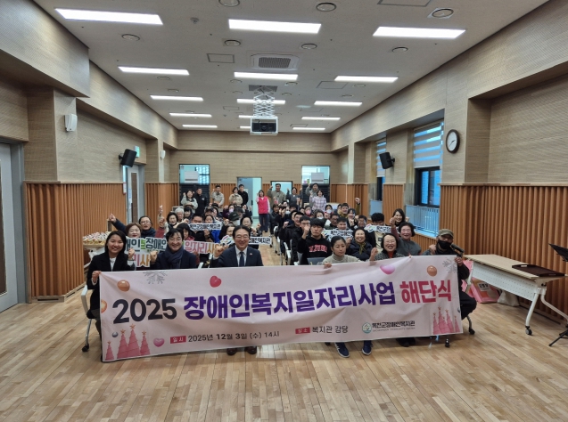 [뉴스노크=김인호 기자] 옥천군장애인복지관이 3일 일자리 참여자의 한 해 동안의 노고를 격려하고 근로 의욕을 높이기 위해 ‘2025년도 장애인복지일자리사업 해단식’을 개최했다.
