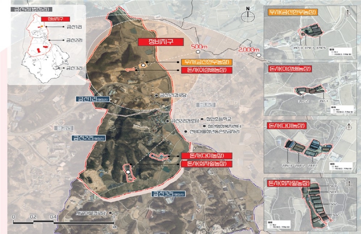 마지막으로 괴산군 청안면 금신 지구는 정비형으로 3년간 사업이 추진되며 사업비 50억원(25억원)을 투입해 돈사 3개소, 우사 1개소를 철거하고, 연계사업으로 청년 농촌 보금자리 조성 사업을 추진할 계획이다.