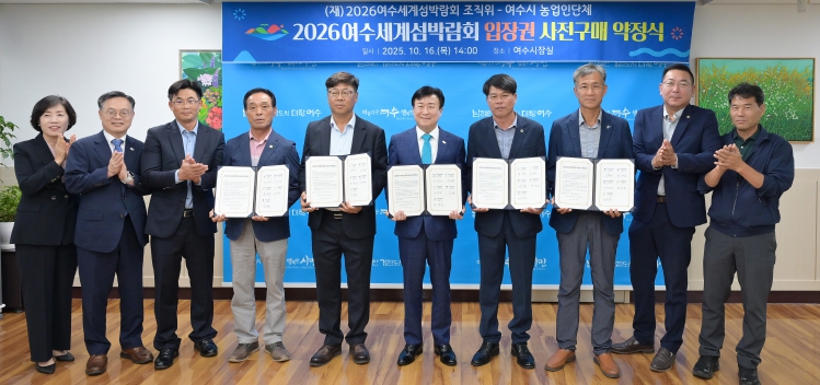 [뉴스노크=김인호 기자] (재)2026여수세계섬박람회조직위원회는 지난 16일 여수시청 시장실에서 여수 농업인 단체와 2026여수세계섬박람회 입장권 1,500만 원 규모의 사전 구매 약정을 체결했다고 밝혔다.