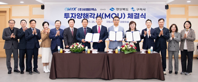 [뉴스노크=김인호 기자] 경상북도와 구미시는 25일 구미시청 3층 대회의실에서 양금희 경상북도 경제부지사, 김장호 구미시장, 박교상 구미시의회 의장, 박성훈 ㈜씨엠티엑스 대표이사 등이 참석한 가운데 ㈜씨엠티엑스와 경상북도·구미시 간 투자양해각서(MOU)를 체결했다.