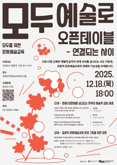 이어지는 종합토론에서는 ‘포용적 문화예술교육 환경 구축을 위한 제언’을 주제로, 장애·비장애를 아우르는 문화예술교육의 가능성과 한계를 예술가, 기획자, 매개자, 기관 등 다양한 시각에서 심도 있게 논의한다. 성북문화예술교육센터 발달장애 워크숍을 이끌어 온 권정원 기획자와 이종현 무용가를 비롯해 정지윤 독립기획·연구자, 최보연 상지대학교 문화콘텐츠학과 교수, 두호영 성북발달장애인평생교육센터 관계자 등이 패널로 참여해 현장과 학계를 아우르는 시사점과 과제를 제시할 예정이다.