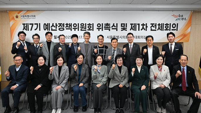 [뉴스노크=김인호 기자] 서울특별시의회는 2025년 12월 17일 제1대회의실에서 위촉식과 제1차 전체회의를 개최하여 시의회의 예산정책기능 강화를 위한'제7기 예산정책위원회'를 출범시켰다. 이날 최호정 의장(서초4, 국민의힘)은 위원들에게 위촉장을 수여했고, 이후 진행된 제1차 전체회의에서 신복자 의원(동대문4, 국민의힘)이 위원장으로 선출됐다.