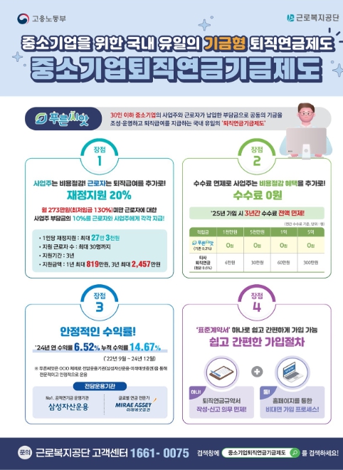 푸른씨앗의 주요 혜택은 ▲월 급여 273만원 미만 근로자에 대해 사업주와 근로자에게 부담금의 10% 지원금 지급 ▲운용수수료 전액 면제 ▲간소한 가입 절차로 사업주의 행정 부담 완화 등이 있다.