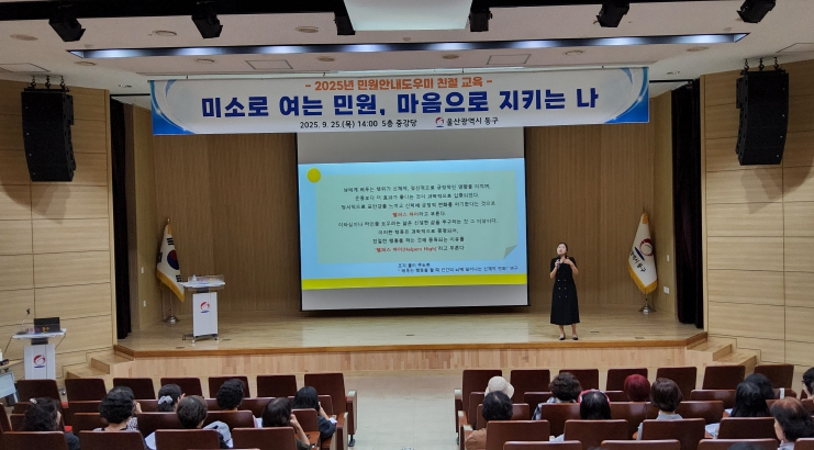 [뉴스노크=김인호 기자] 울산 동구는 9월 25일 동구청 5층 중강당에서 구청과 보건소, 종합사회복지관의 자원봉사 민원 안내 도우미 60여 명을 대상으로 친절 교육을 했다.