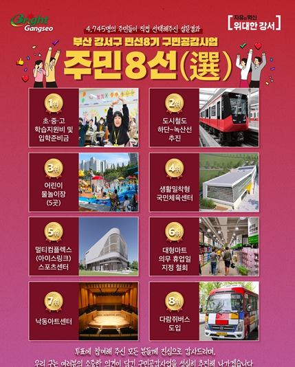 [뉴스노크=김인호 기자] 부산 강서구는 민선8기 3년간 추진한 주요 사업 가운데 주민이 직접 선정한 ‘주민 8선(選)’을 발표했다. 이번 조사는 지난 8월 14일부터 9월 13일까지 구 홈페이지(PC 또는 모바일)를 통한 온라인 설문 방식으로 진행됐으며, 총 4,745명이 참여해 큰 관심을 모았다.