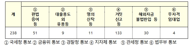 ① (해외자금 불법반입) 해외에서 1만 달러를 초과하는 현금을 휴대반입 후 신고하지 않거나, ‘환치기(외국환은행을 거치지 않고 자금을 불법반입)’를 통해 자금을 반입한 것으로 의심되는 경우 39건