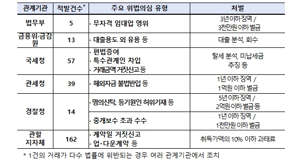 아울러, 외국인 위법행위에 대한 법적제재 조치 상향을 관계부처간 논의하고, 자금조달계획서에 해외자금 조달내역도 포함*하는 한편, 외국에서의 탈세혐의에 대해서도 본국으로 적극 통보하기로 했다.