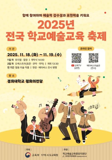 [뉴스노크=김인호 기자] 교육부와 17개 시‧도교육청은 11월 18일부터 11월 19일까지 경희대학교 평화의전당(서울)에서 2025년 전국 학교예술교육 축제를 개최한다.