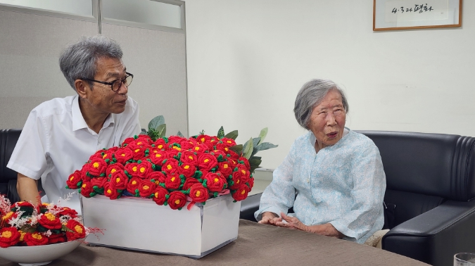 ▲ 제주4‧3 유족 홍을생 어르신 손뜨개 동백꽃 세 번째 기탁 |