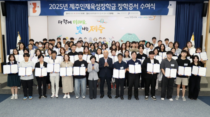 [뉴스노크=김인호 기자] 제주특별자치도가 27일 오전 10시 도청 탐라홀에서 2025년 제주인재육성 장학금 장학증서 수여식을 열고, 제주 출신 고등학생 및 대학(원)생 222명에게 장학금을 전달했다.