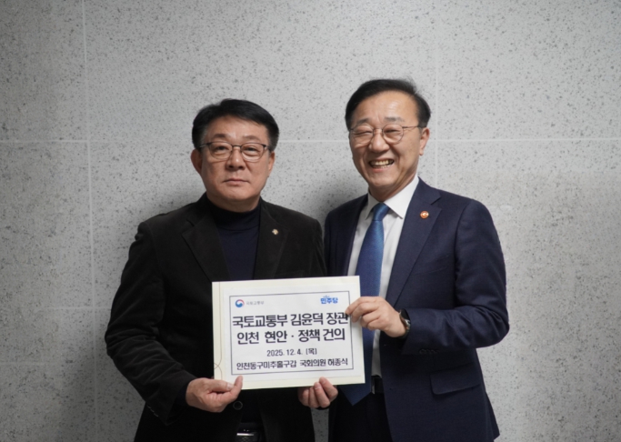 [뉴스노크=김인호 기자] 더불어민주당 허종식 의원(국회 기후에너지환경노동위·인천 동구미추홀구갑)이 4일 국회에서 김윤덕 국토교통부 장관을 만나 ‘인천 지역 국토·교통 현안 건의서’를 전달하고, 정부 차원의 적극적인 대책 마련을 촉구했다.
