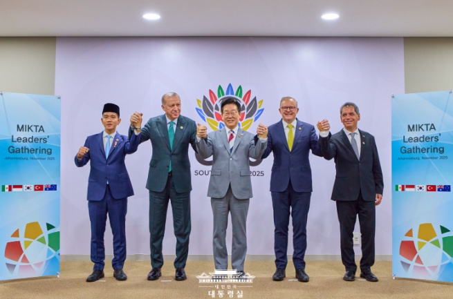 [뉴스노크=김인호 기자] 주요 20개국(G20) 정상회의 참석을 위해 남아프리카공화국을 방문한 이재명 대통령은22일(현지시간) 오후 우리나라, 멕시코, 인도네시아, 튀르키예, 호주 5개국으로 구성된 믹타(MIKTA) 회원국 정상들과 회동했다.