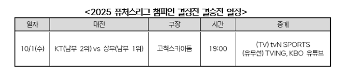 퓨처스리그 초대 챔피언이 결정될 결승전은 10월 1일(수) 오후 7시 고척스카이돔에서 열리며, 결승전은 TVING과 tvN SPORTS 및 KBO 유튜브를 통해 중계된다.