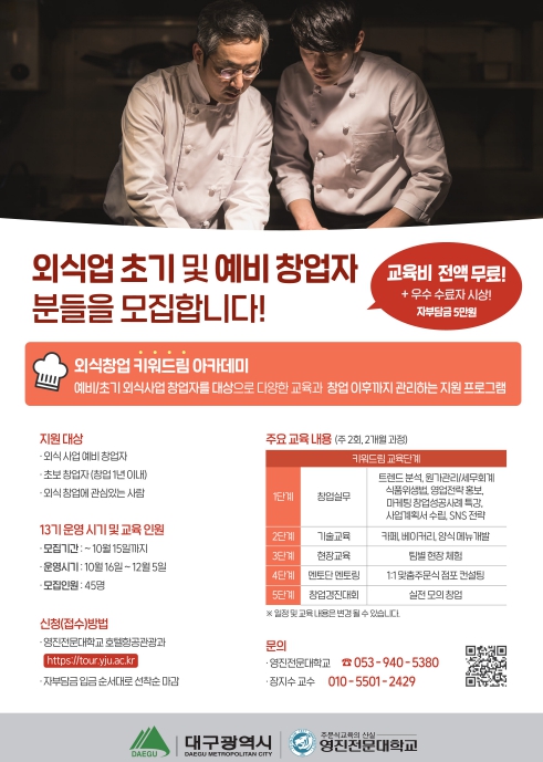 [뉴스노크=김인호 기자] 대구광역시는 외식업 예비창업자와 초기 창업자의 안정적 정착을 지원하기 위해 외식창업 ‘키워드림’ 아카데미 13기 참가자를 10월 15일까지 모집한다.