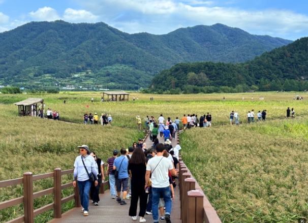 [뉴스노크=김인호 기자] 추석 연휴 순천만습지를 찾은 방문객들이 가을 정취 속에서 갈대밭 산책을 즐기고 있다.